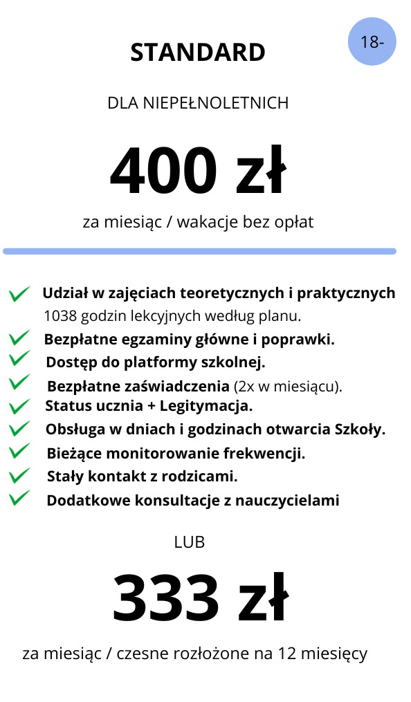 Standardowa oferta dla osób, które nie ukończyły 18 lat oraz dla tych, którzy chcą korzystać z konsultacji z nauczycielami również po lekcjach.