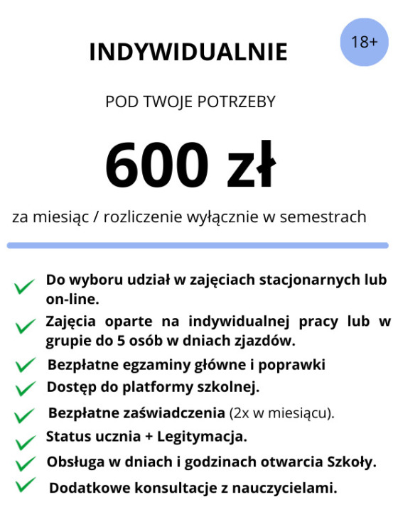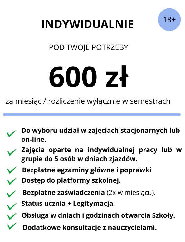 Stworzyliśmy ofertę premium dla osób, które z różnych powodów nie mogą uczestniczyć w zajęciach prowadzonych w standardowej klasie (np. lęk przed dużą grupą). W takich przypadkach organizujemy lekcje w kameralnych klasach 5-10 osób a tempo i program jest dostosowywany do poziomu całej grupy. Taka forma zajęć daleka jest od spotkań klasowych a bardziej przypomina korepetycje. Mimo pewnych udogodnień realizujemy pełną podstawę programową.